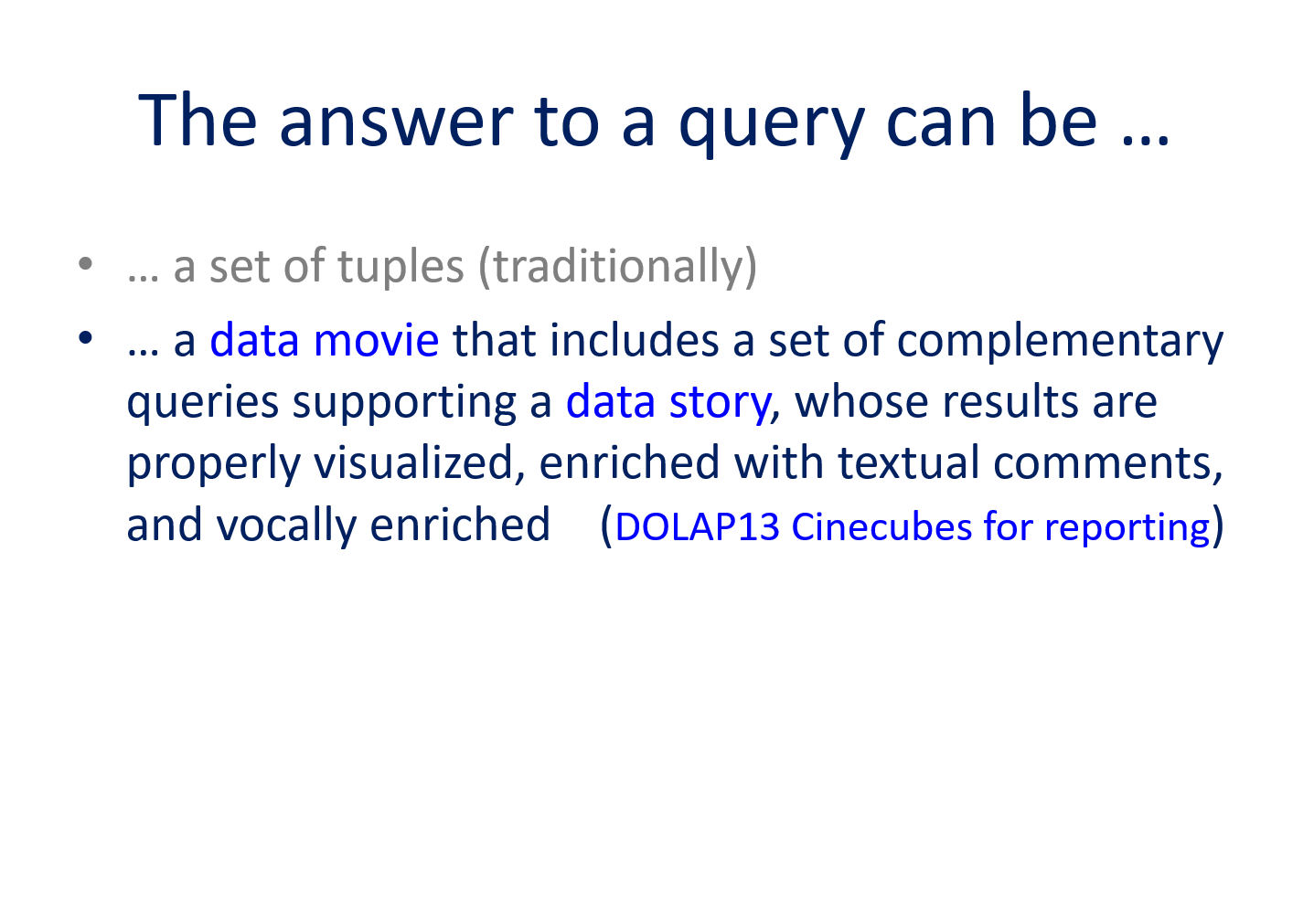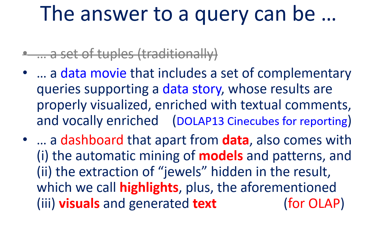Panos Vassiliadis, Patrick Marcel. The road to highlights is paved with good intentions: envisioning a paradigm shift in OLAP modeling. 20th International Workshop on Design, Optimization, Languages and Analytical Processing of Big Data (DOLAP 2018), 26 March 2018, Vienna, Austria (co-located with EDBT/ICDT 2018).